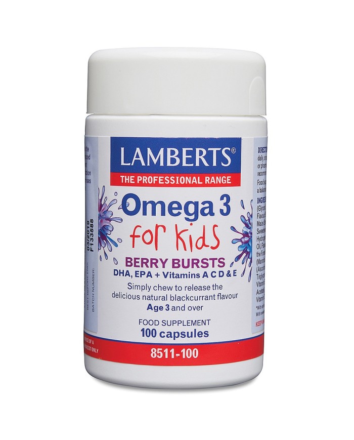 Lamberts® Omega 3 Berry Bursts have been specially formulated for those aged 3 years and over. Chewing the soft capsule releases a burst of delicious natural blackcurrant flavour and delivers essential Omega 3 fatty acids alongside the vital vitamins A, C, D and E.