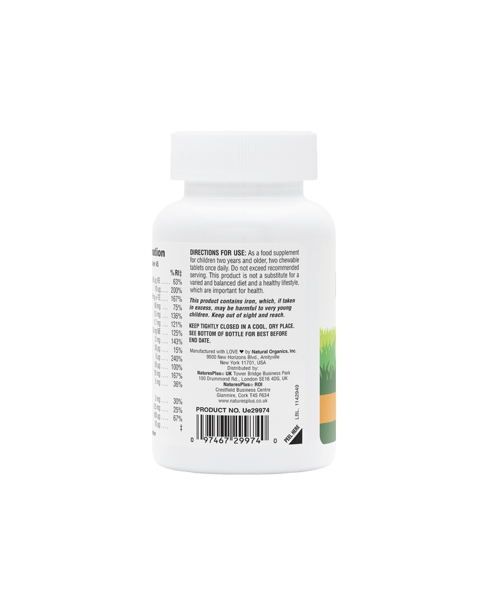 - A SPECIAL FORMULA FOR CHILDREN: Each chewable tablet supplies 16 vitamins, 8 minerals, and nature's most healthful whole foods, including spirulina, carrot, broccoli, whole brown rice, and spinach.